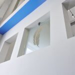 Feathr wanted to ensure their office would be a collaborative space that would add to the synergy of their team, while still offering quiet spaces for discussing business with clients and brainstorming ideas. Three private offices and two smaller phone booth-style offices are delineated by new polished glass walls, allowing for solitude while working without secluding employees. Above the phone booth offices, an accent wall with Feathr’s custom logo, complete with its signature light blue, a feather symbol, and name, proudly overlooks the area. A white accent wall which acts as a room divider features three square cutouts, one with a glass panel with an imprinted image of a feather for a distinctive, avant-garde touch that is personalized especially for the tech company.