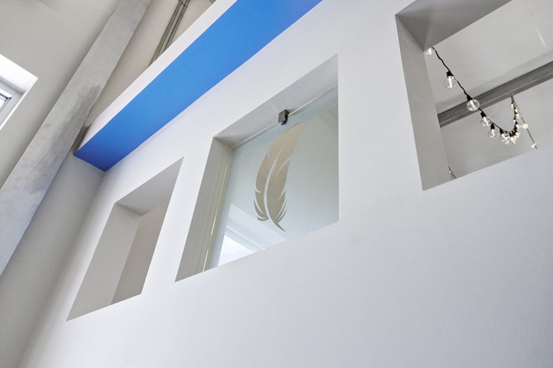 Feathr wanted to ensure their office would be a collaborative space that would add to the synergy of their team, while still offering quiet spaces for discussing business with clients and brainstorming ideas. Three private offices and two smaller phone booth-style offices are delineated by new polished glass walls, allowing for solitude while working without secluding employees. Above the phone booth offices, an accent wall with Feathr’s custom logo, complete with its signature light blue, a feather symbol, and name, proudly overlooks the area. A white accent wall which acts as a room divider features three square cutouts, one with a glass panel with an imprinted image of a feather for a distinctive, avant-garde touch that is personalized especially for the tech company.